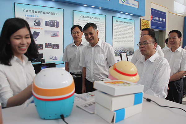 在園區(qū)展示廳,于春生聽取了北海工業(yè)園區(qū)管委會主任朱會東對北海市打造千億元電子信息產(chǎn)業(yè)規(guī)劃,中國電子北海產(chǎn)業(yè)園發(fā)展進程匯報以及下一步以信息服務(wù)業(yè)為主導(dǎo),以智能硬件和創(chuàng)意設(shè)計為重要支撐產(chǎn)業(yè),政企聯(lián)合共建中國電子北部灣信息港的規(guī)劃介紹,陪同參觀了園區(qū)長城能源、冠捷科技、三諾電子等企業(yè)產(chǎn)品。在園區(qū)企業(yè)三諾電子產(chǎn)品體驗區(qū),饒有興趣的聽取了工作人員對新穎的數(shù)碼音響產(chǎn)品演示及介紹。在創(chuàng)業(yè)成果展示區(qū),于春生觀看了園區(qū)管委會、科技局、產(chǎn)業(yè)園三方合作共建的北部灣孵化器創(chuàng)業(yè)企業(yè)科遙奇智能機械手演示,聽取了蘊芯科技電子芯片產(chǎn)品專利技術(shù)介紹、產(chǎn)品銷售及推廣,了解了會圈紅包的互聯(lián)網(wǎng)+營銷模式,鼓勵創(chuàng)業(yè)青年以市場為導(dǎo)向,結(jié)合自有特色,抓住產(chǎn)業(yè)發(fā)展機遇做大做強。當(dāng)于春生得知科遙奇、海云智慧等好幾家創(chuàng)業(yè)企業(yè)在國家、自治區(qū)一級創(chuàng)業(yè)大賽上榮獲嘉獎,蘊芯科技、瀟鳴進出口貿(mào)易等企業(yè)產(chǎn)品訂單源源不斷暢銷國內(nèi)外市場時,于春生對園區(qū)發(fā)展電子信息制造業(yè)的同時,重視中小微企業(yè)創(chuàng)業(yè)創(chuàng)新,并取得積極成效給予充分肯定,對中國電子發(fā)揮電子信息國家隊帶動作用,引領(lǐng)龍頭企業(yè)集聚北海,實現(xiàn)了北海電子信息產(chǎn)業(yè)量與質(zhì)的飛躍,對地方產(chǎn)業(yè)結(jié)構(gòu)調(diào)整中的貢獻給予充分肯定,稱贊了園區(qū)良好的發(fā)展環(huán)境。臨行前,于春生囑咐園區(qū)繼續(xù)加強陽光工程建設(shè),以務(wù)實的工作作風(fēng),嚴明紀律,打造一個陽光、優(yōu)質(zhì)的千億元電子信息產(chǎn)業(yè)基地。